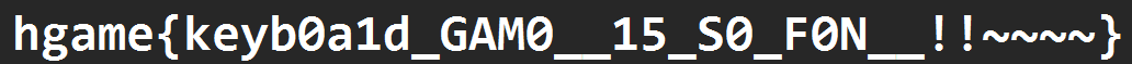 运行结果:hgame{keYb0a1d_gam0__15_s0_f0n__!!~~~~}