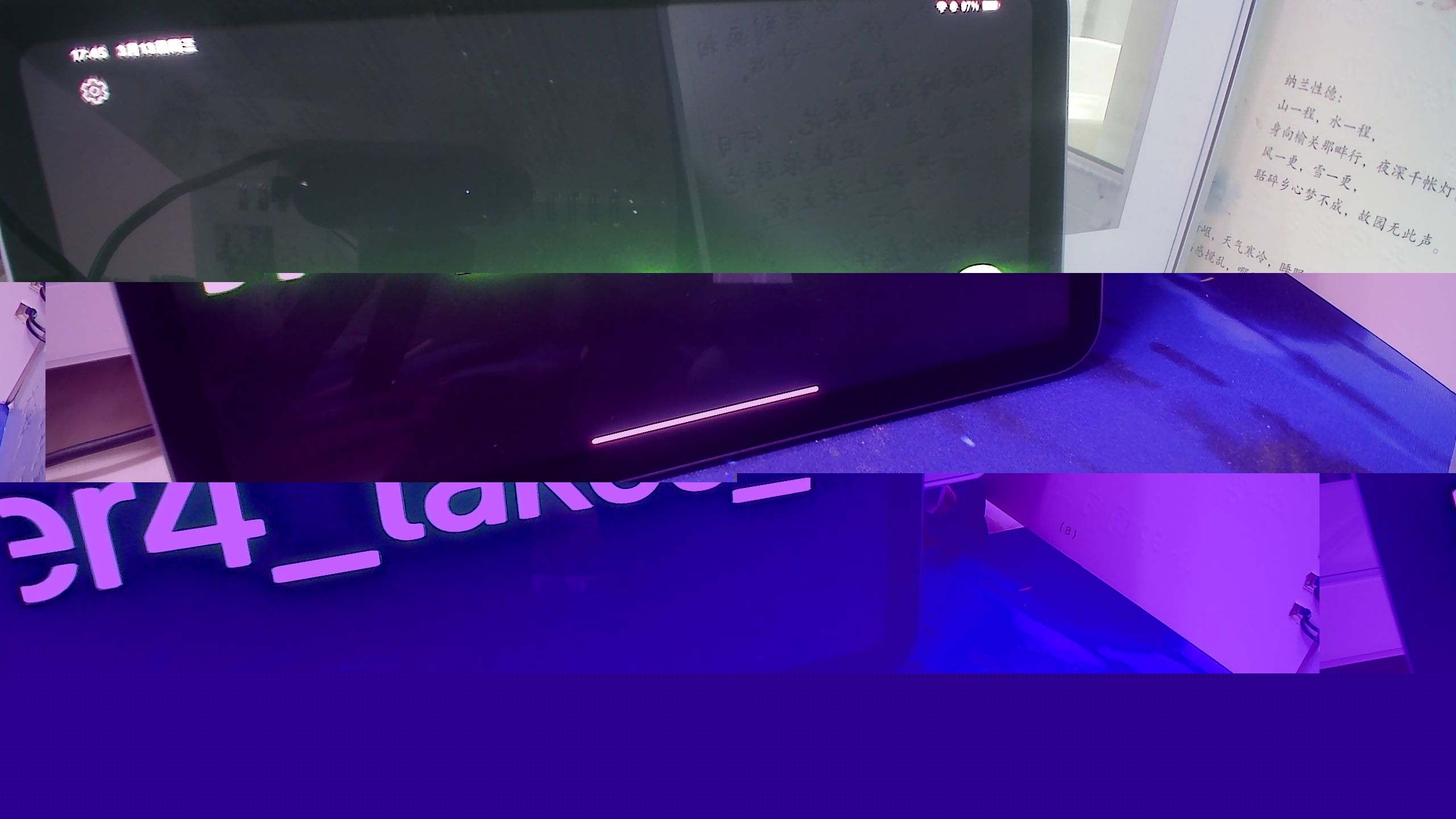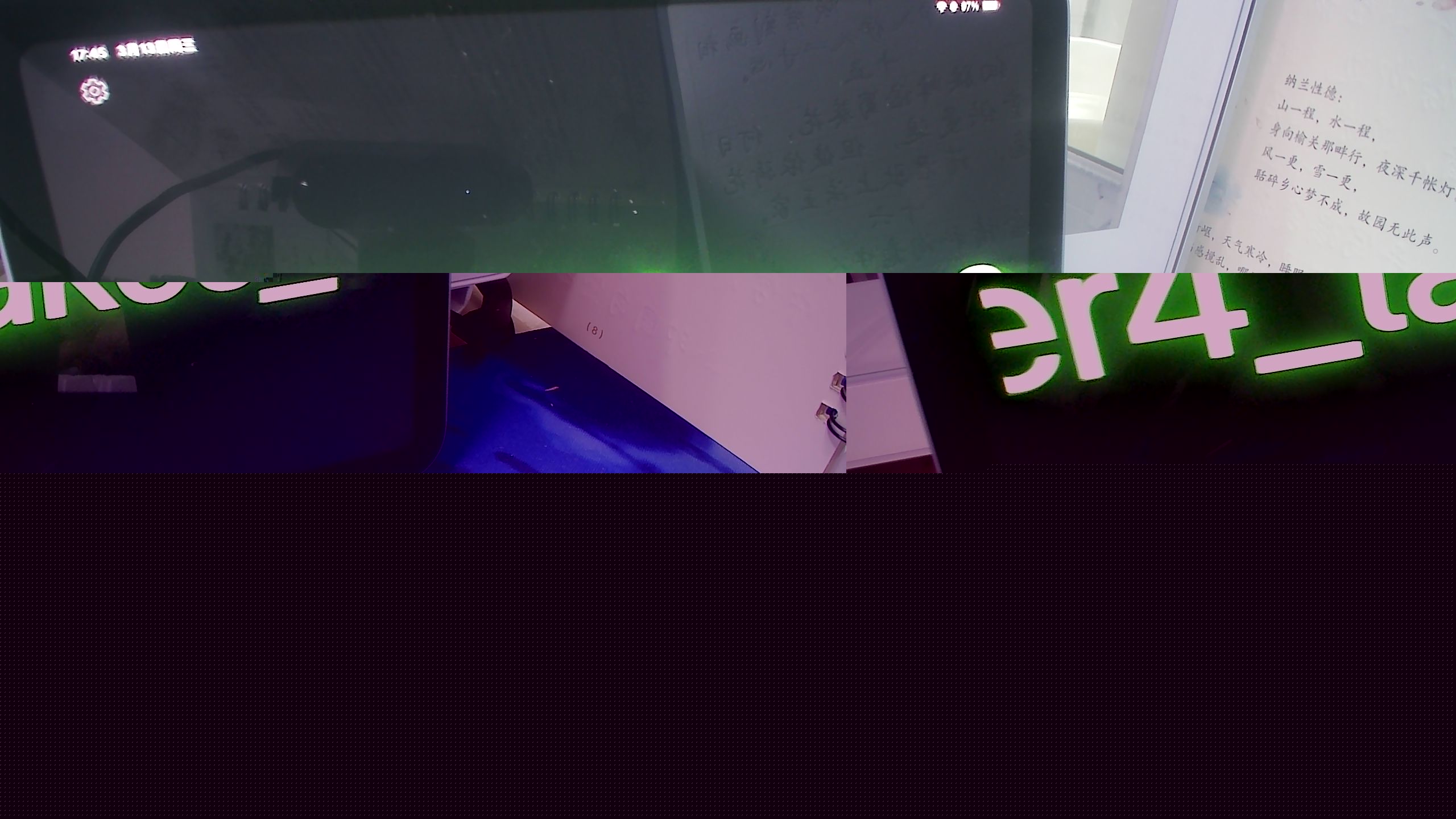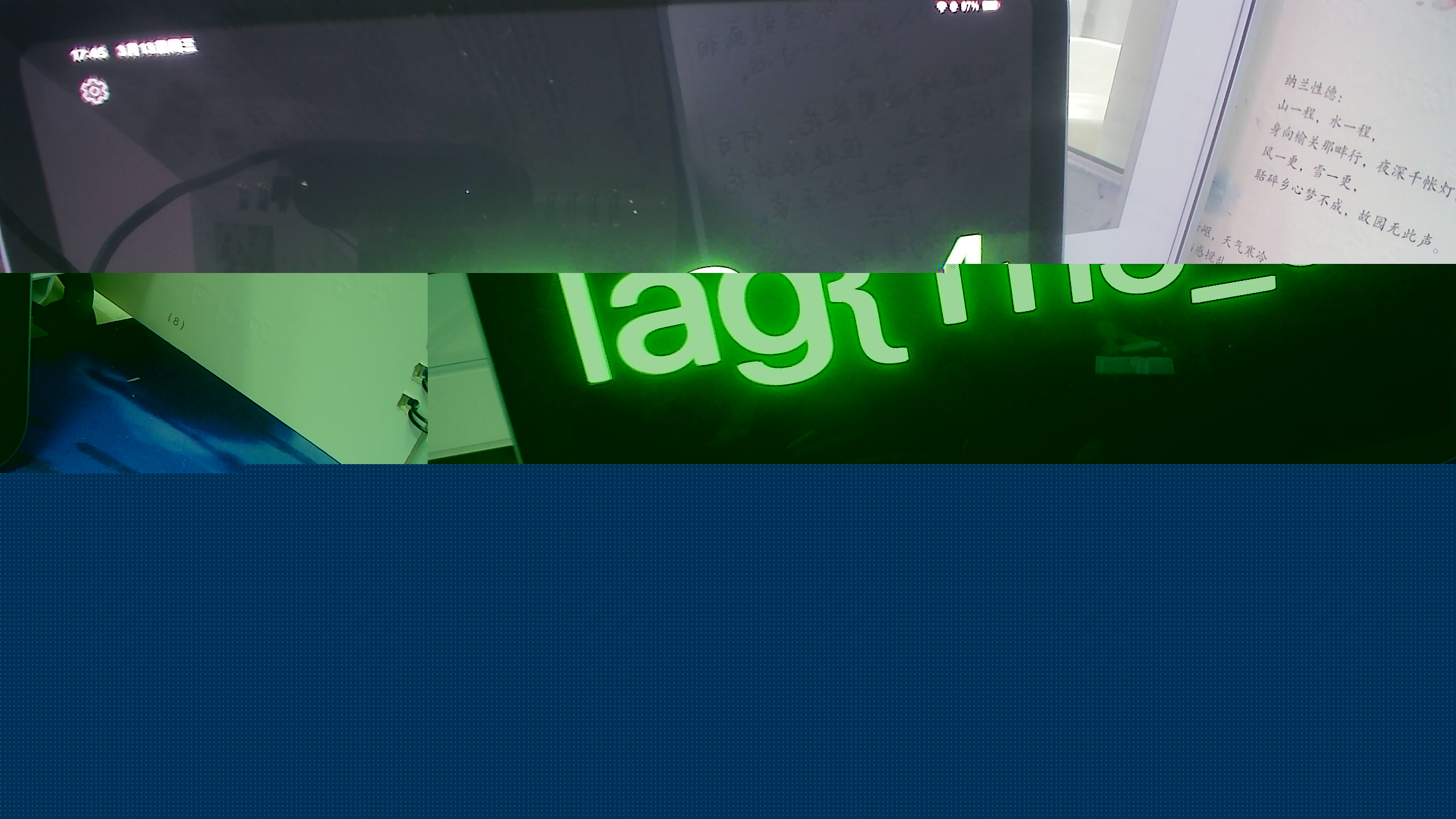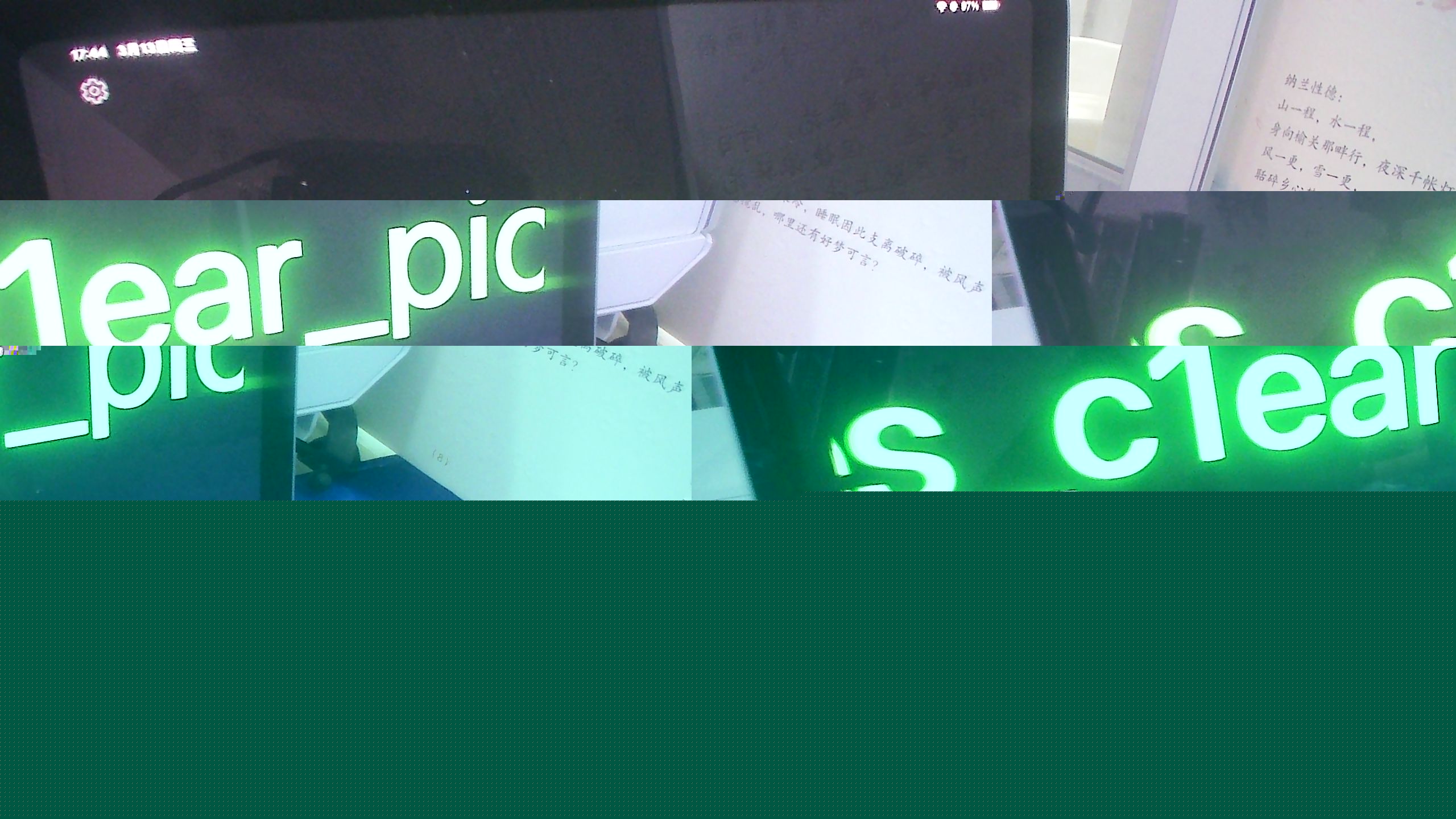 描述说是摄像头记录,wireshark启动发现是USB流量,简单翻了翻能看到基本都是以jpg图片的形式传输信息的,一开始先试着导出了frame.number==1的usb.iso.data,里面分了好几段,有固定的数据头0c啥的,距离jpg文件头有24字节,试着把每一段开头都删掉24字节,再把逗号删了,发现提取出来的图片还是很清晰的,不过只有一小部分,大小是60kb,frame.number==2对应的也是jpg数据,加在第一张图片后面就行了,连续搞了三段共180kb大小的图片,初见端倪:
