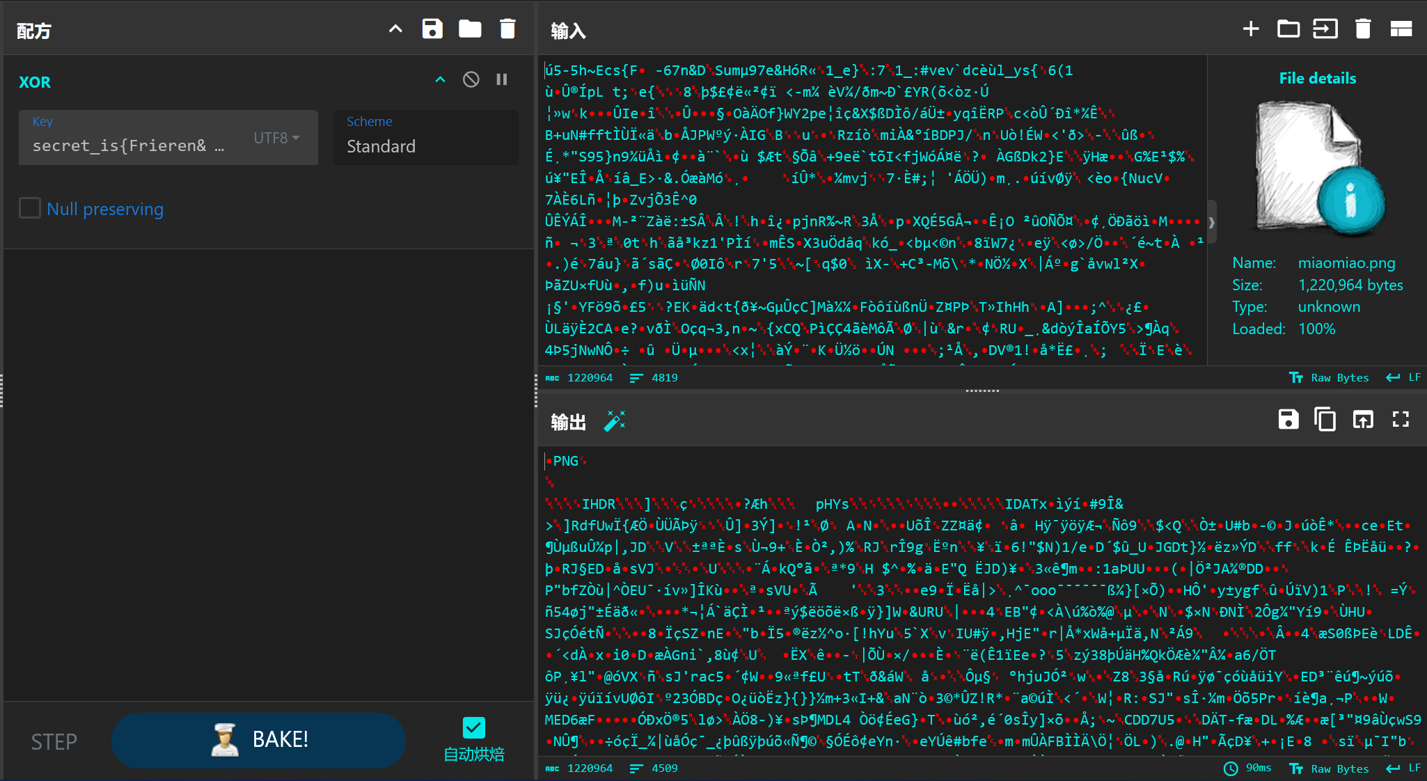 解压缩包里面一个png,不过内容显然被加密过了,试了试异或png头,发现开头是sec,想着肯定是异或刚刚的口令: